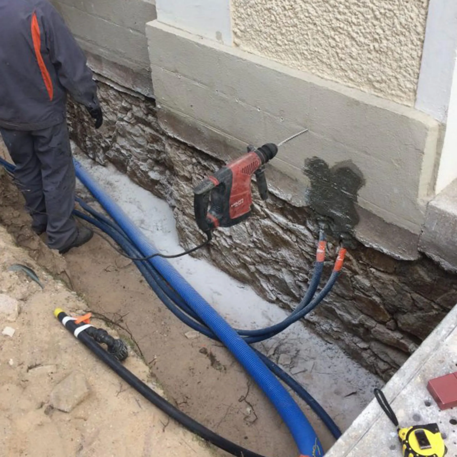Traitement de l’humidité Ascensionnelle des murs par injection de barrière étanche en polymère contre les remontées capillaires.